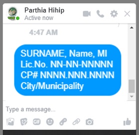 - MESSAGE your Name, License Number, CP#, and Location