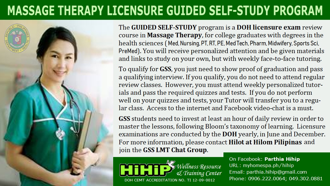 Therapy. Twice yearly, HiHiP conducts review courses for the DOH Massage Therapy Licensure Exams. Its original innovation is a gentle and melodious